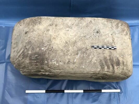 Arqueólogos encontraram na Escócia uma antiga bigorna de pedra que preserva as marcas de mãos e joelhos do antigo caldeireiro