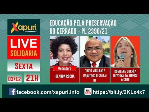 ❤️ LIVE SOLIDÁRIA Educação pela preservação do Cerrado – PL 2390/21 ⏰ Dia: 03/12 às 21h 📍 Mediadora : Iolanda Rocha 🗣️ Convidado: 📌Chico Vigilante – Deputado Distrital/DF 📌Rosilene Corrêa – Diretora do SINPRO e CNTE