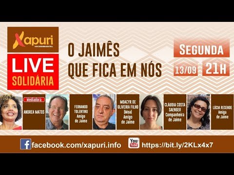 ❤️ LIVE SOLIDÁRIA O JAIMÊS QUE FICA EM NÓS ⏰ Dia: 13/09, às 21h 📍 Mediação: Andrea Matos 🗣️ Participação: 📌 Cláudia Costa Saenger – Companheira de Jaime 📌 Fernando Tolentino – Amigo de Jaime 📌 Moacyr de Oliveira Filho (Moa) – Amigo de Jaime 📌 Lúcia Resende – Amiga de Jaime