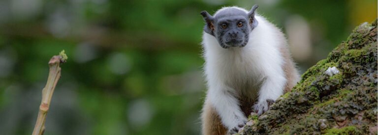 O sauim-de-coleira (Saguinus bicolor) tem um padrão de coloração marcante composta por uma faixa branca de pelos que se estende do peito até o pescoço, formando a “coleira” que inspira seu nome popular. Esse pequeno sagui vive em grupos de 2 a 13 indivíduos, alimentando-se de frutas, flores, néctar, insetos e, ocasionalmente, ovos de aves. À noite, costumam se aninhar na base de folhas de grandes palmeiras, um abrigo natural para cuidar de seus filhotes, que geralmente nascem aos pares, após uma gestação de pouco mais de cinco meses.