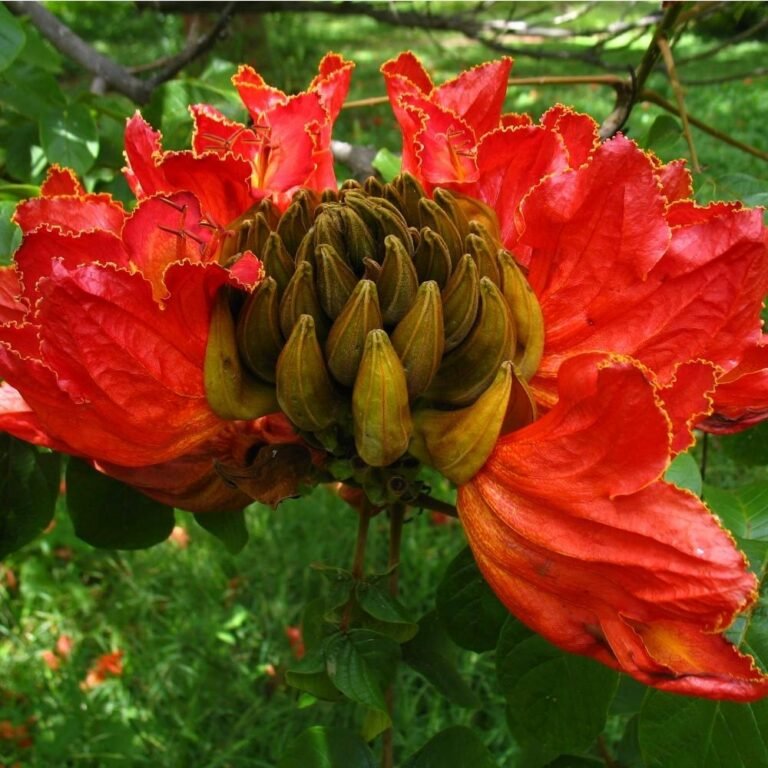 A Espatódea (Spathodea campanulata) é uma árvore exótica, originária da África, que tem feito muito sucesso no Brasil, sendo plantada em calçadas, quintais e sítios. Isso porque, além de linda, com majestosas flores vermelho-a laranjadas, a planta tem crescimento rápido – sendo uma ótima opção para paisagismo.