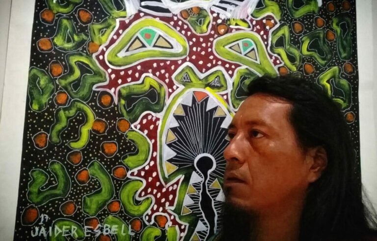 Nascido em 1979 em Normandia, estado de Roraima (hoje Terra Indígena Raposa Serra do Sol), Jaider Esbell, da etnia Makuxi, é figura central na consolidação da arte indígena brasileira e mundial.